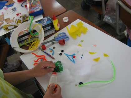 今週の図工は,身の回りの材料を使って作りたいものを作る「これでかけるよ」です。毛糸や布・綿・モール・ビーズなど思い思いの材料で,楽しい作品を作っています。
