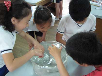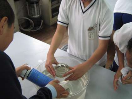 この単元では,物を燃やし,物や空気の変化を調べ,燃焼のしくみについて考えています。この日は,びんに酸素を集めて,その中で燃える様子を調べる学習です。みんなで協力して活動できています。