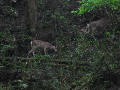 雨で延期になった遠足。今日はとてもいいお天気で,元気いっぱい出発しました。銀閣寺道のおみやげやさんの前を通り過ぎた頃には,もう汗が出ていましたが,山道にさしかかるとひんやりした空気が…。どこからか小鳥の鳴き声も聞こえてきます。ふと見上げるとなんと鹿が2頭,木の葉を食べていました!