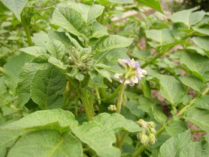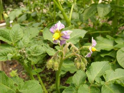 花が咲いています。何の花でしょうか・・・。そう,ジャガイモの花です。先週からぐっと大きく育っています。きれいな花が咲きました。じゃいもはできているかな・・・楽しみですね。