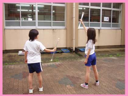 朝から降っていた雨も午後になり止んだので,中庭で グループごとに集まって練習しました。