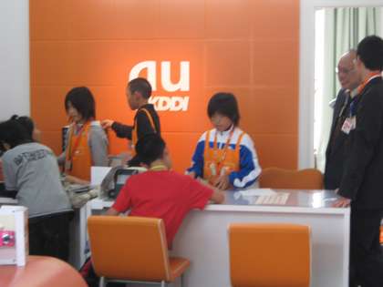 電話会社ブースでは,個人や会社に電話やけい帯電話の商品説明をして,けい約をしてもらいました。