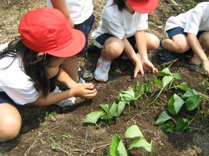 「葉っぱのある茎から根が出るなんて不思議だね。」「大きなおいもができるといいね。」と言いながら植えました。これから大切に育てていきます!