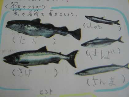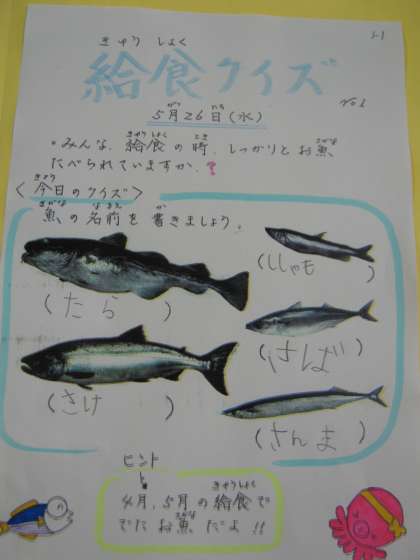 給食調理員さんが作って下さった給食クイズです。お魚について名前を当てるクイズです。クラスみんなでお魚の種類を一生懸命考えていました。楽しく考えていました。