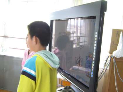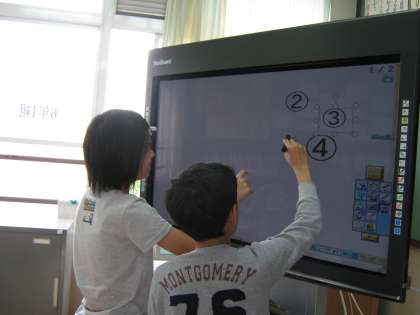 この説明文の文章構成を考える授業です。前の時間にそれぞれの考えを発表しましたが,今日は,もう一度みんなで整理しているところです。電子黒板を使って,児童自身で操作しながら学習を進めています。