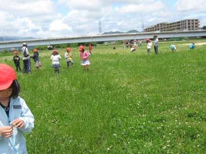 知っている以上の水かさがありました。水の流れを、遠くからみながら、河川敷のつくりにも、発見がありました。クロ−バー広場・グランド・畑などたくさんの利用に、自分たちの町の大きな発見に大喜びしました。