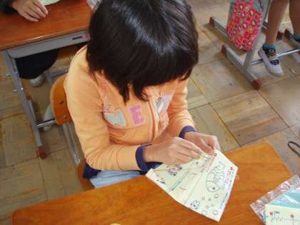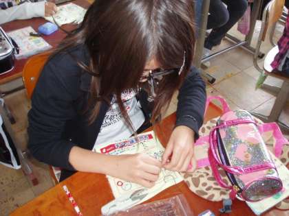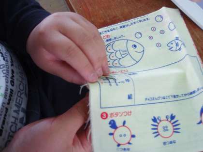 布にチャコえんぴつで自分のクラス・名前を下書きしてから,名前の縫いとりをしました。「斜めになっているところが難しい。」「玉どめがきれいにできた!」など言いながら,集中して取り組んでいました。