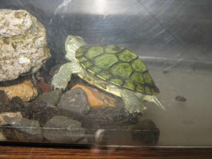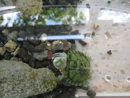 ショクくんはとても元気に泳ぎ回っています。えさもたくさん食べています。上の写真は、ショクくんが息をするために顔を出した瞬間です。下の写真は、えさをねらっているときのショクくんです。