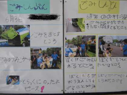 社会の時間に作っていたごみ新聞が、完成しました。3組掲示板にはっていますので、機会があれば見にきてください。クイズも付いています。