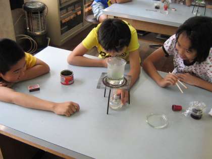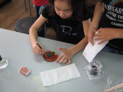 日光をあてた葉とあてていない葉をヨウ素液を使い反応がでるかどうか実験しました。