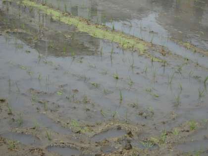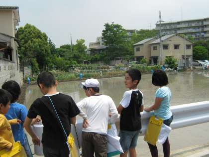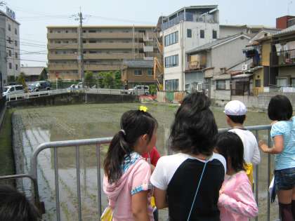 西京極駅からの帰りには,アクアリーナから団子田町,七条通りを通って学校の南の田んぼまで行きました。休みの間に田植えがされていて,きれいに苗が並んでいる様子を見ることができました。