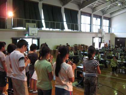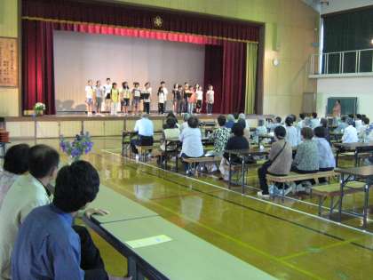 社会福祉協議会主催で地域のお年寄りを招いての「春の昼食会」に6年生21名が参加しました。昼食のお手伝いと普段,音楽科で学習している曲を歌とリコーダー演奏で発表しました。