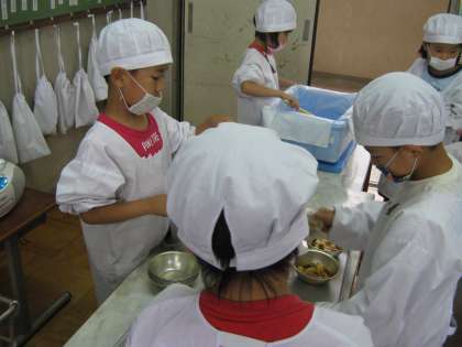自分たちだけでおかずを入れたり,配ったりするのも上手になってきました。