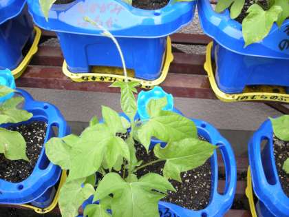 あさがおが大きくなってきました。本葉の枚数も増えてきています。ツルも伸びてきているあさがおも多くなりました。