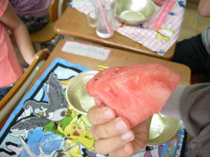6月15日(火)給食で「すいか」がでました。とっても甘くておいしかったです。給食のメニューも夏野菜のあんかけごはんと牛乳いかとくきわかめのごま酢煮でした。夏野菜のあんかけの中には,万願寺とうがらし・なす・たまねぎ・にんじんなど入っていてとてもおいしかったです。