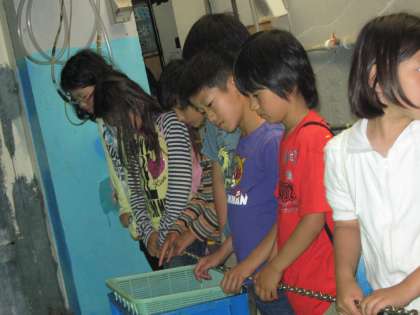 ものすごい勢いでえさを食べる魚たちに子どもたちは感動していました。