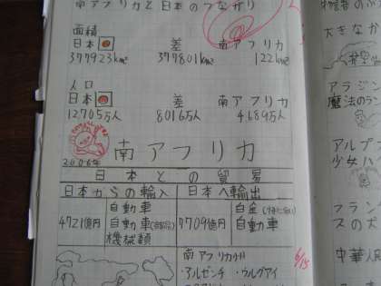 自主勉強ノートです。サッカーワールドカップの始まった日、南アフリカについて調べてきた人がいました。他にも、サッカーの試合結果の感想を書いてきている人もいます。