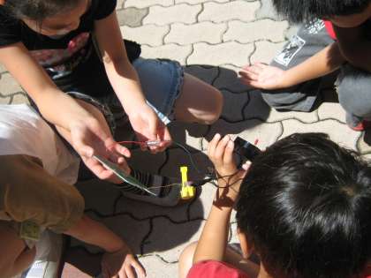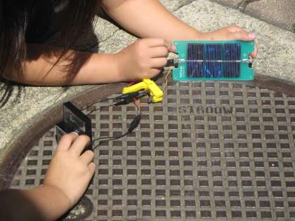 今日は晴れたので,光電池を使った実験を行いました。