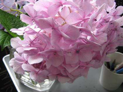 クレパスで描いたあじさいに絵の具を使って色を塗っていきます。