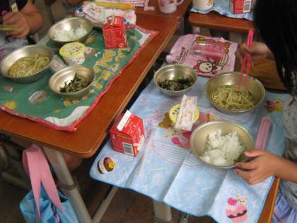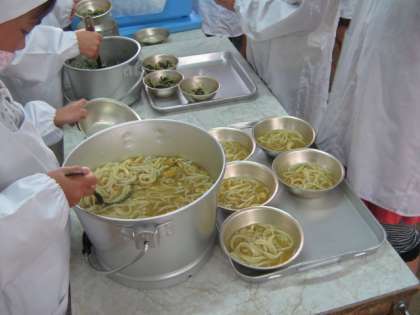 「食器の大きさを間違えたらあかんな。」と言いながら給食室から運んできました。熱いうどんも自分たちでしっかり配膳できています。グループでお話しながら楽しくいただきます!