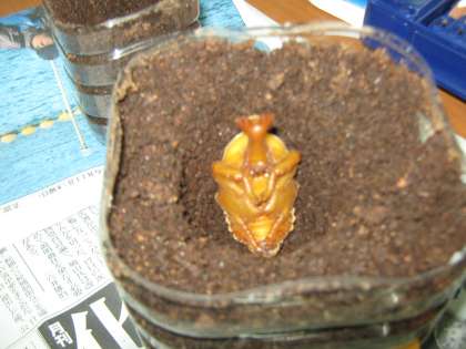 3組でかっていたカブトムシの幼虫が、さなぎになりました。立派な角があるのでおすです。早く成虫になってほしいな。