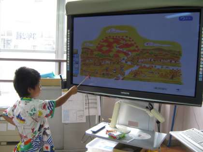 国語の学習でも電子黒板を活用しています。「デジタル教科書」では,教科書をそのまま映せるだけでなく,朗読を聞いたり,挿絵や本文を大きくして映すこともできます。『三年とうげ』の学習では,挿絵を見ながら気がついたことをたくさん発表し,お話の内容を理解するのにたいへん役立ちました。