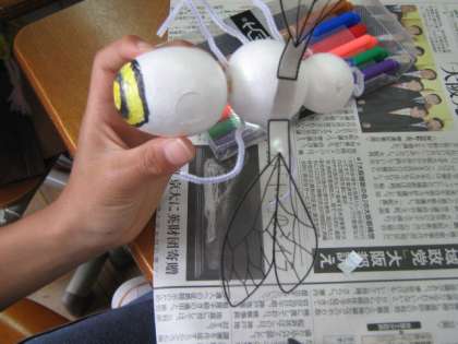 理科の学習で,こん虫のからだのつくりを理解するために,模型を作りました。頭・むね・はらの3つの部分をつなぎ,頭には目としょっ角をつけ,6本のあしはむねから出ています。自分のこん虫のイメージで色をつけて完成です。模型作りはこん虫のからだのつくりを理解するのに役立ったでしょうか。
