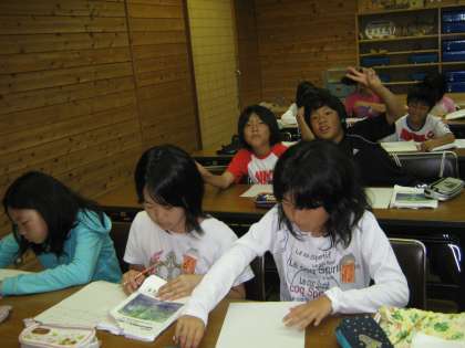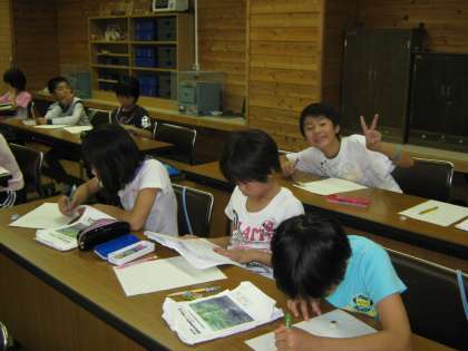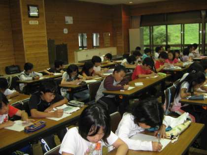 山の家で過ごす,最後の夜です。家族の人に,木のはがきを書きました。