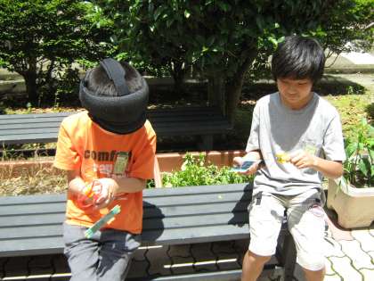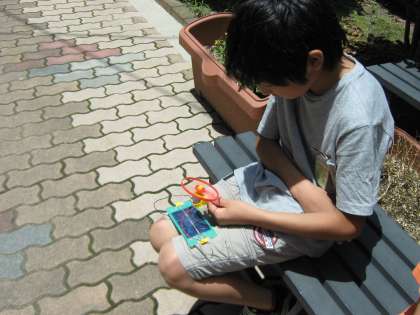 理科の学習で、電池の働きを勉強しています。今日は、光電池について勉強しました。ソーラーパネルでプロペラ回るかな?