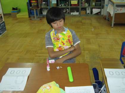 歯の学習として、カラーテスターを使って磨きのこしを調べました。歯と歯の間や、歯と歯ぐきの付け根などが特に色が濃く染まっていました。これからは、気をつけて磨きたいです。