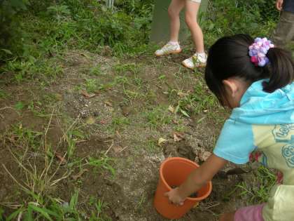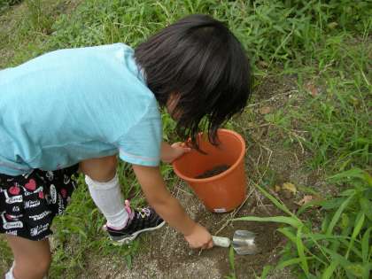 牛乳パックで育ててきた苗を植木鉢に植え替えました。土を一生懸命に入れていました。