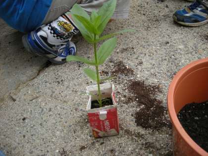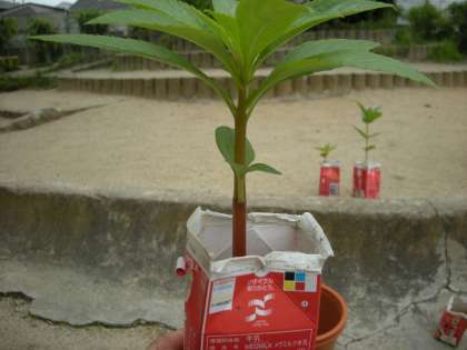 こんなに牛乳パックで育ちました。百日草・ほうせんかです。とても育ったので驚きました。