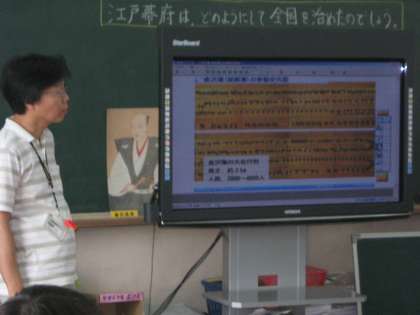 社会の歴史学習をしました。「江戸幕府は,どのようにして全国を治めたでしょう。」という学習でした。電子黒板で「大名行列」をみて気づいたことを発表し合いました。いろいろなことを考えるいい発表がたくさんでました。