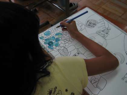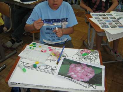 線描きが終わり,絵の具を使っての彩色に移る児童が増えてきました。