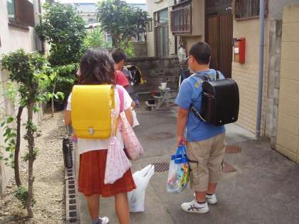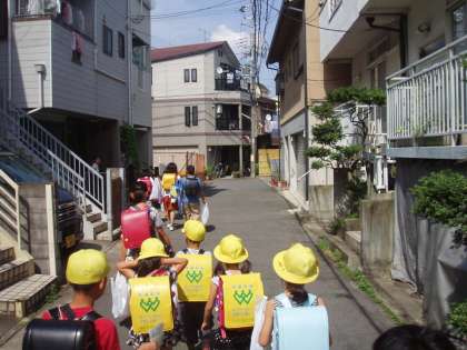 町別児童集会終了後,各登校班で,独り暮らしのお年寄りの方へ