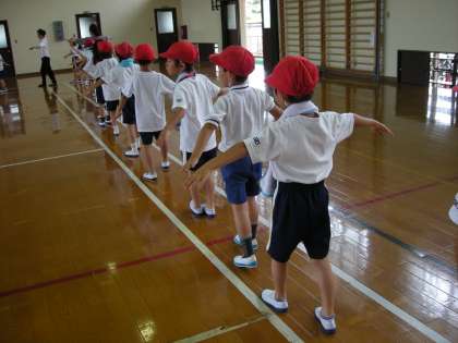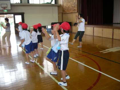 「運動会までにもっとわが町音頭を練習しようね。」と言い合う一年生です。