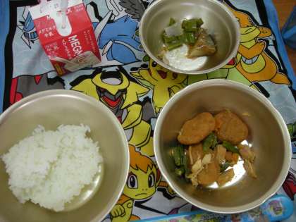 今日の給食は,ごはん・牛乳・平天の煮付け・京野菜のごまみそかけでした。