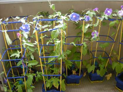 あさがおをおかあさんが懇談後お家に持ち帰られます。雨も降ったりやんだりなので,廊下に並べました。