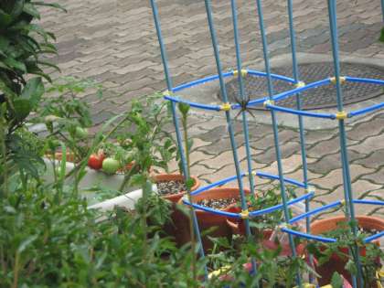 理科の観察中に突然現れたクモ。 2年生の野菜をねらっているのかな?