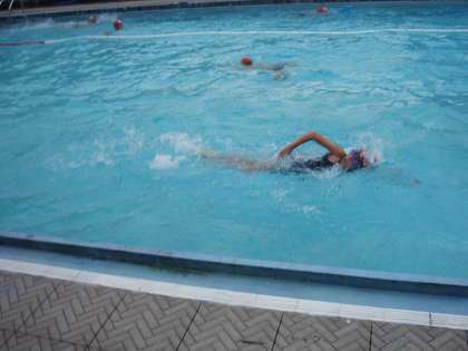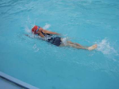 練習するコースでは,上手に泳ごうと友達と