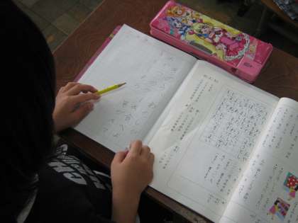 教科書の例文をていねいにノートに視写しています。