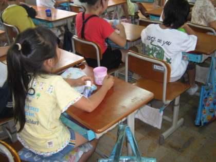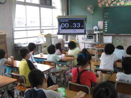 毎週木曜日はフッ化物洗口です。子どもたちは自分で時計を見ながら1分間の洗口を行っています。教室の時計では見にくいので,ここでも電子黒板が活躍しています。大きくストップウォッチを映せるので,右20秒・左20秒・仕上げ20秒がやりやすいです。夏休みも歯みがきをがんばって,むし歯のないきれいな歯を保ってほしいです。