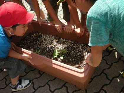 予備に植えていた苗が大きくなりました。夏休みも近いので,みんなで植え替えました。一人ひとり役割を見つけ,汗を流しながら頑張りました。