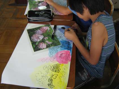 図工の時間に、あじさいの絵に色つけをしました。とてもきれいにできました。