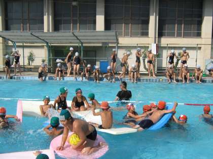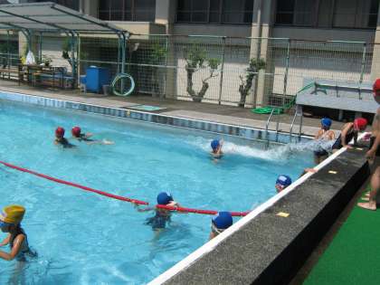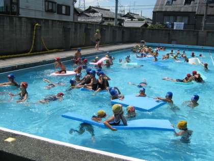 夏休み2日目。でも昨日は光化学スモッグ注意報発令のため,低学年がプールに入れなかったので,低学年にとっては初めてのプールでした。昨日,直前で中止になったせいもあってか,今日は100名近い子どもたちが参加し,元気いっぱい水しぶきをあげていました。自由泳ぎだけでなく,25mに挑戦する子どもたちもいました。
