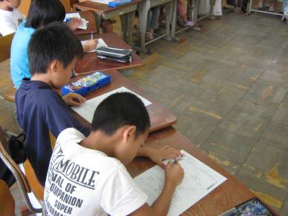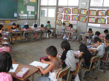 みんなで机を円にして,プリントなど今までの学習の復習をしています。