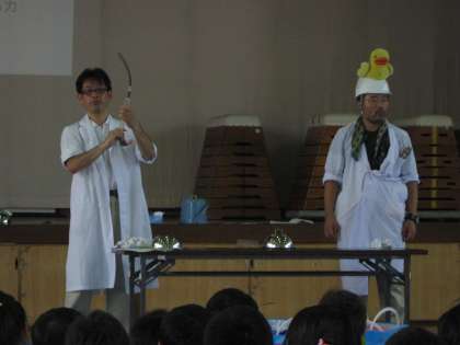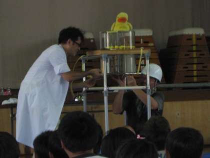 サマーチャレンジの1日目、科学教室がありました。いろんな実験を見せてくれました。とてもおもしろかったです。