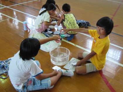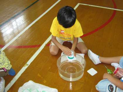 いろいろな実験を見せていただいた後、体験コーナーがありました。「マジカルカップ」という、ひっくり返しても水がこぼれないカップを作りました。すごく不思議なカップです。