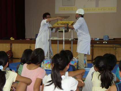 27日にサマースクールがありました。この日は,科学教室でした。2人の【博士とポンチくん】先生が楽しい実験を見せた下さいました。