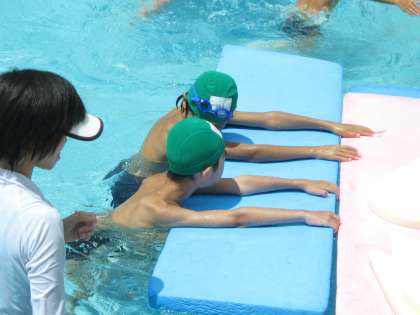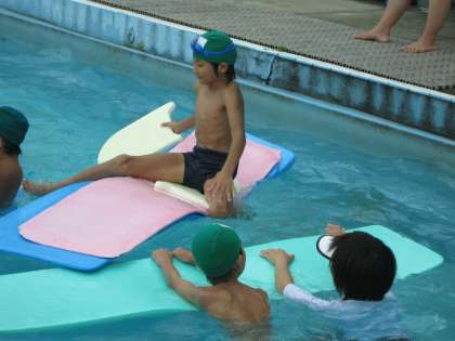 碁石拾いゲームやビート板リレーの後、お待ちかねの自由遊びの時間です。大きなビート板に2人で乗ったり、いろんなことをして楽しみました。